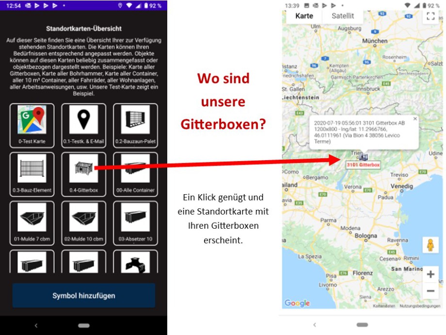 Aber nicht nur die Frage: "Wo sind unsere Gitterboxen?" könnte interessant sein. Auch die schnelle Antwort auf Fragen wie: "Ist die Gitterbox XY schon am Zielort angekommen?". Wo steht die Gitterbox mit den Gasflaschen?", "Wo sind unsere Gitterboxpaletten H500mm mit halber Klappe?" usw., könnte hilfreich sein. Da wir beliebige Karten generieren können, sind Ihren Abfrageanforderungen kaum Grenzen gesetzt.